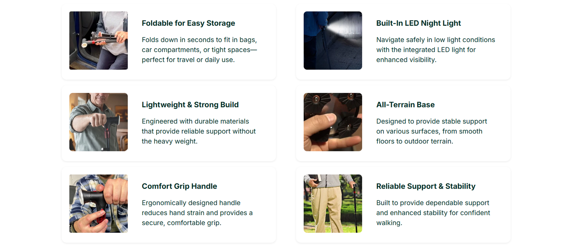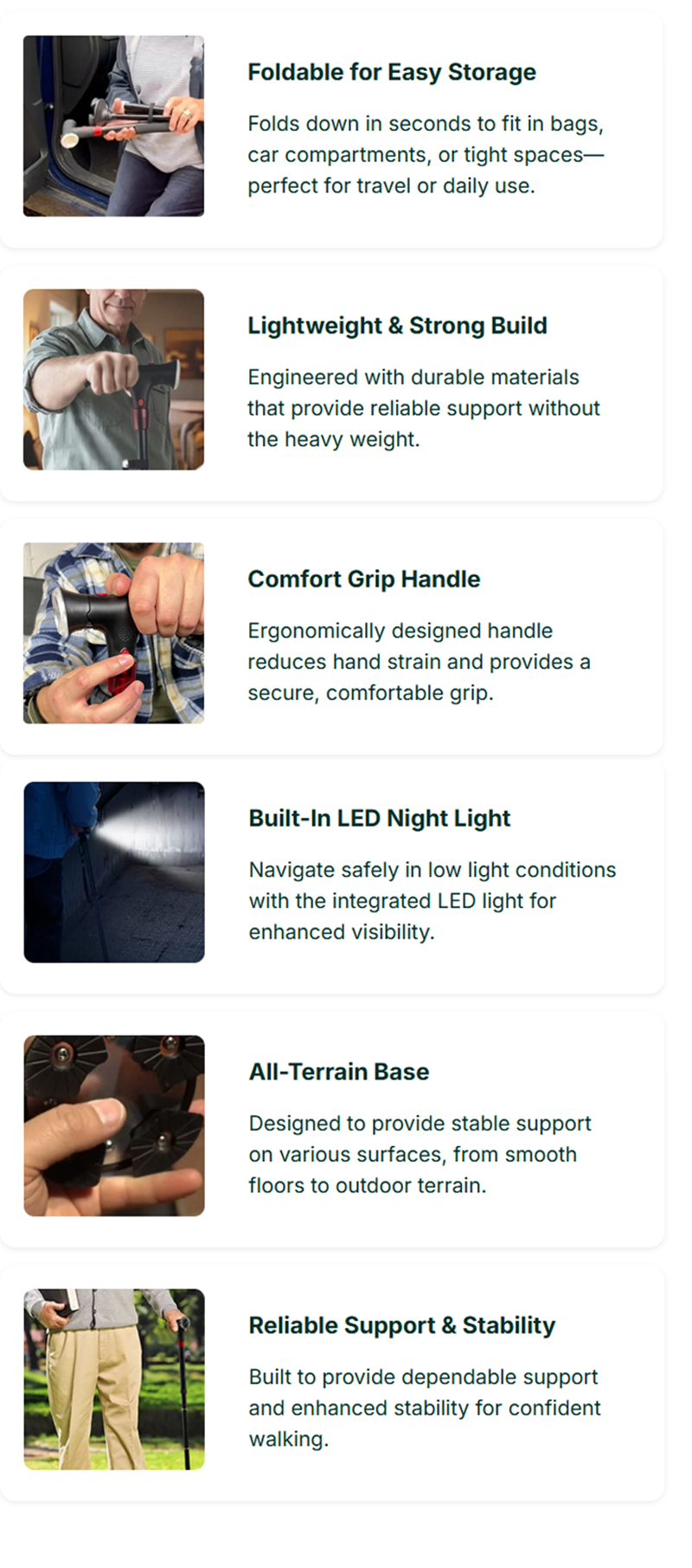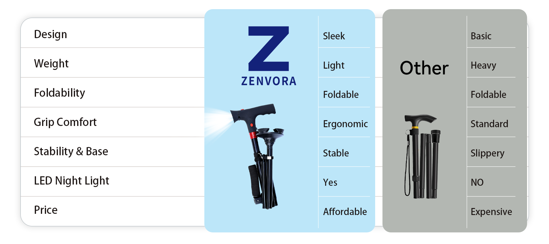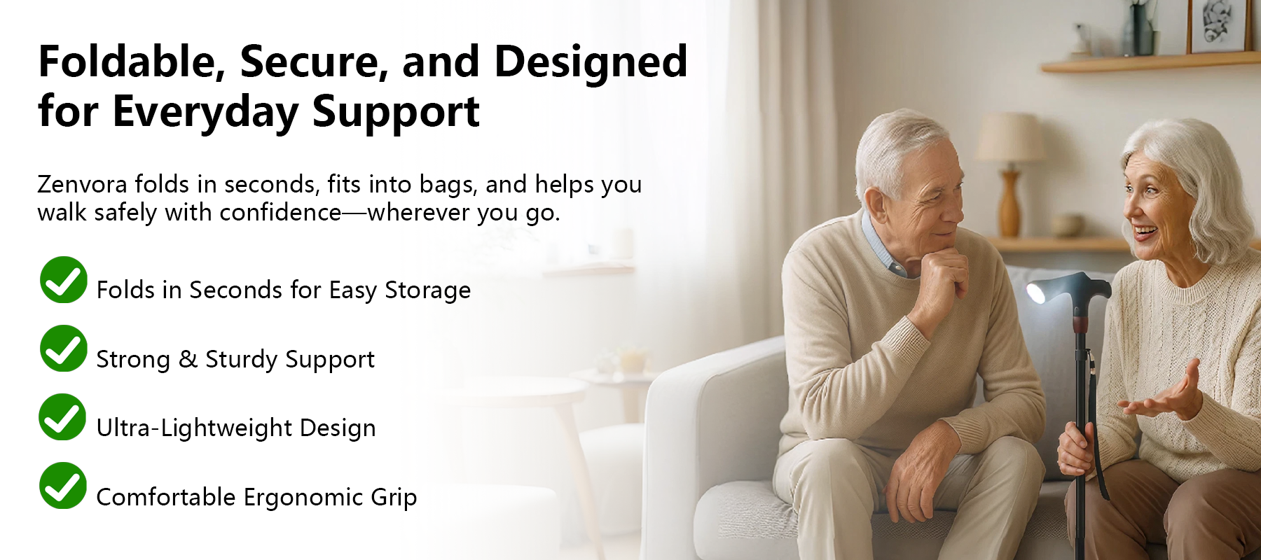 Zenvora designs lightweight, foldable canes with ergonomic grips, sturdy all-terrain bases, and built-in LED lights. Each cane is made to help you walk with confidence and ease — offering stability, comfort, and peace of mind wherever you go.